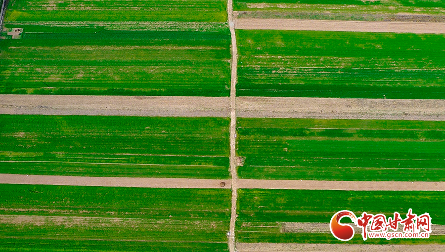 初冬時(shí)節(jié),平?jīng)鍪谐缧趴h錦屏鎮(zhèn)農(nóng)田里冬小麥長(zhǎng)勢(shì)喜人,從空中俯瞰,給田野鋪上了綠色的地毯。
