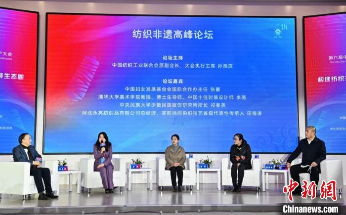 中國婦女發(fā)展基金會國際合作辦主任張蕾,清華大學(xué)美術(shù)學(xué)院教授、中國十佳時裝設(shè)計師李薇,中央民族大學(xué)少數(shù)民族服飾研究所所長祁春英,河北永亮紡織品有限公司總經(jīng)理、高陽民間染織技藝省級代表性傳承人田海濤等分享了各自在紡織非遺方面的實踐故事。