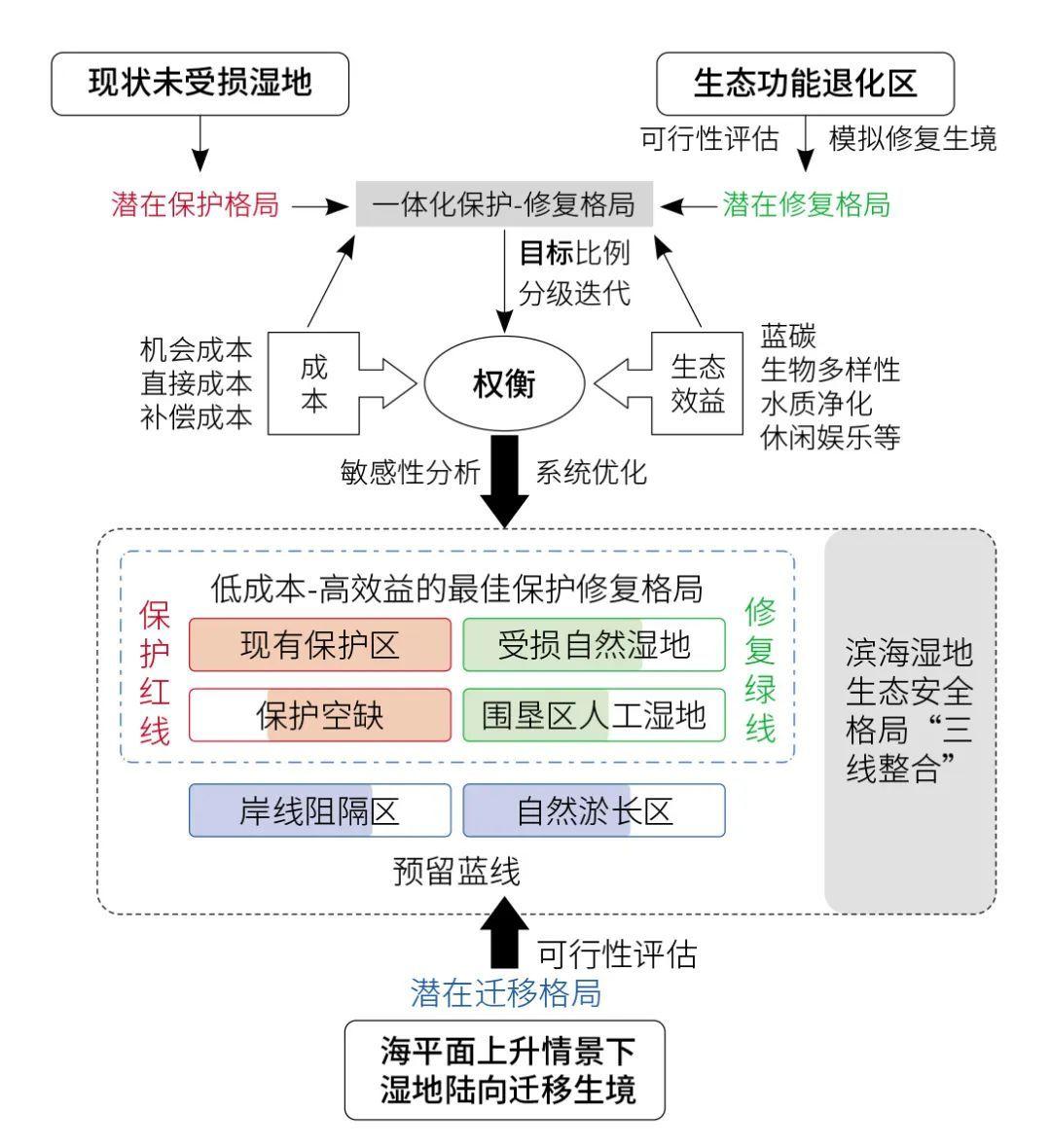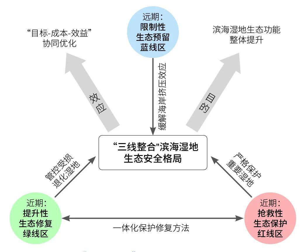其概念構架強調(diào)一體化整合保護與修復格局,同時兼顧濱海濕地應對海平面上升的長期適應性,構建對濱海生態(tài)系統(tǒng)整體功能提升最惠益的生態(tài)安全格局,包括:近期搶救性生態(tài)保護紅線區(qū)與提升性生態(tài)修復綠線區(qū),以及遠期限制性生態(tài)預留藍線區(qū),由此構建應對圍墾開發(fā)和適應未來海平面上升情形下,基于“三線整合”的濱海濕地生態(tài)安全格局(圖1)。