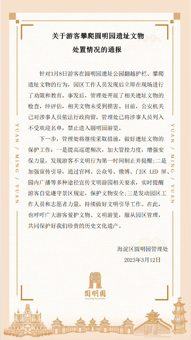 《通報(bào)》指出,針對(duì)3月8日游客在圓明園遺址公園翻越護(hù)欄、攀爬遺址文物的行為,園區(qū)工作人員發(fā)現(xiàn)后立即在現(xiàn)場(chǎng)進(jìn)行了勸阻和教育。事發(fā)后,管理處開展了相關(guān)遺址文物的檢查,經(jīng)評(píng)估,相關(guān)文物未受到損害。目前,公安機(jī)關(guān)已對(duì)涉事人員依法行政拘留,管理處已將涉事人員列入不受歡迎名單,禁止進(jìn)入圓明園游覽。