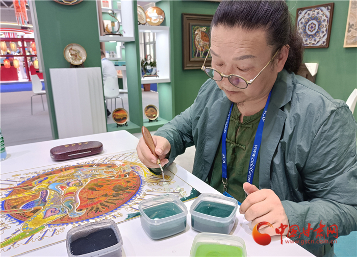 深圳文博會(huì)首日,李海明選擇現(xiàn)場(chǎng)制作九色鹿掐絲琺瑯畫。