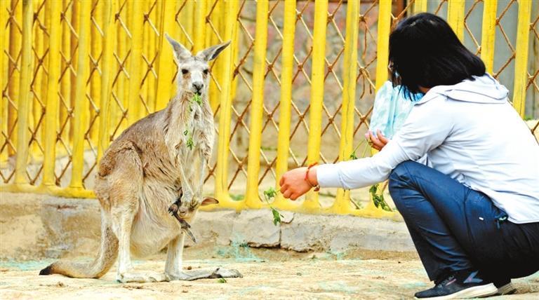 而7個(gè)月大的灰袋鼠還躲在媽媽的育兒袋里,飼養(yǎng)員說還有一個(gè)月,它就可以下地走路了。