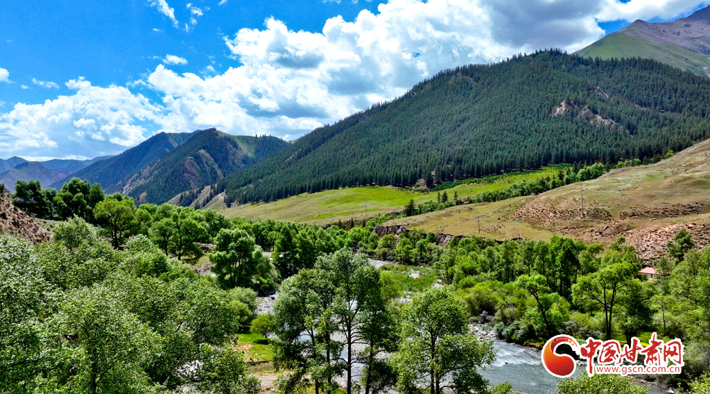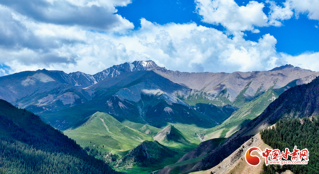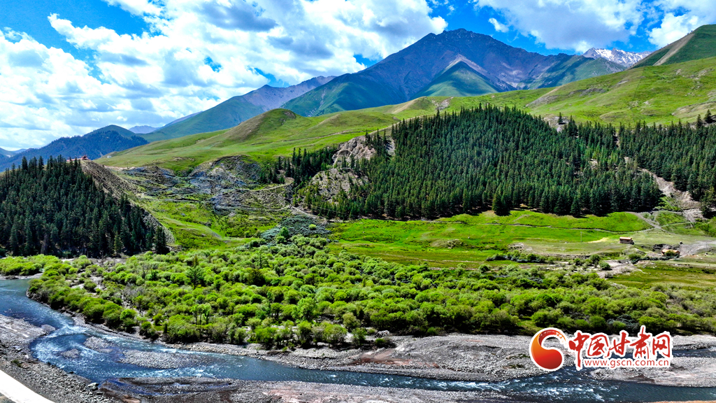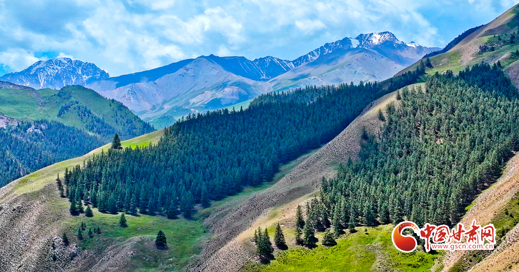 6月29日,在祁連山國家公園甘肅省張掖市肅南裕固族自治縣大河鄉(xiāng)段,藍(lán)天白云下,巍峨壯麗的祁連山蒼松翠柏,水光粼粼,構(gòu)成一幅美麗的畫卷。