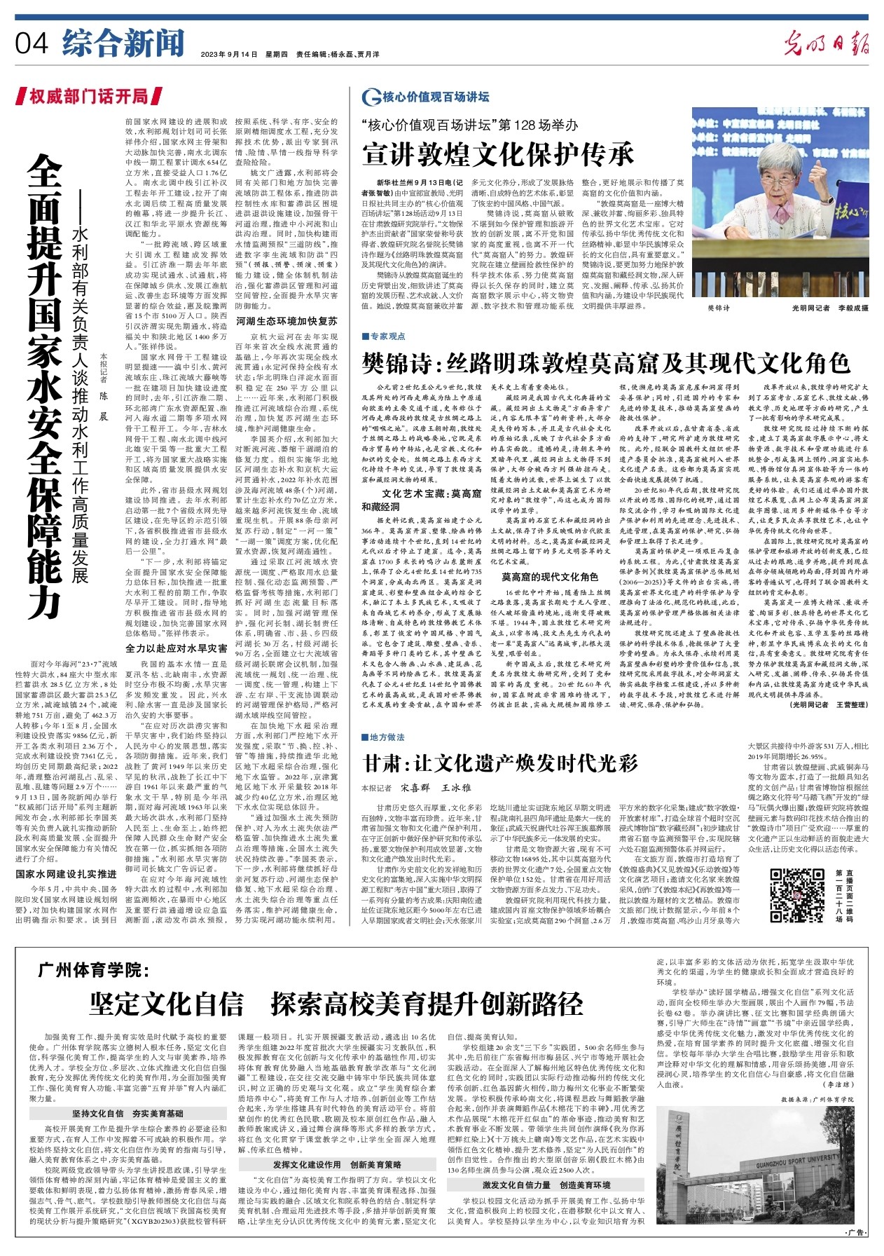 新華社蘭州9月13日電(記者 張智敏)由中宣部宣教局、光明日報社共同主辦的“核心價值觀百場講壇”第128場活動9月13日在甘肅敦煌研究院舉行。“文物保護(hù)杰出貢獻(xiàn)者”國家榮譽稱號獲得者、敦煌研究院名譽院長樊錦詩作題為《絲路明珠敦煌莫高窟及其現(xiàn)代文化角色》的演講。
