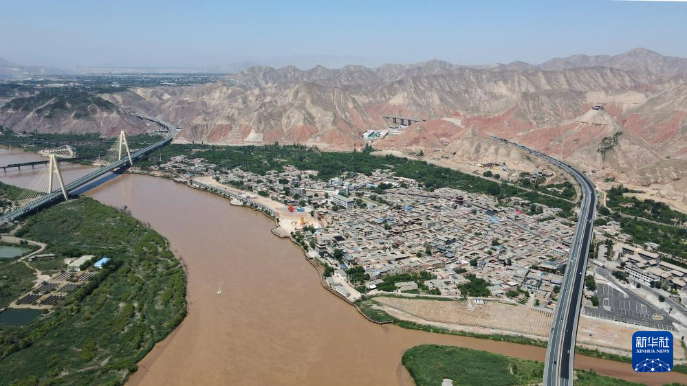 緊鄰甘肅省蘭州市西固區(qū)河口古鎮(zhèn)的高速公路大橋橫跨黃河(7月9日攝,無人機照片)。新華社記者 張可任 攝