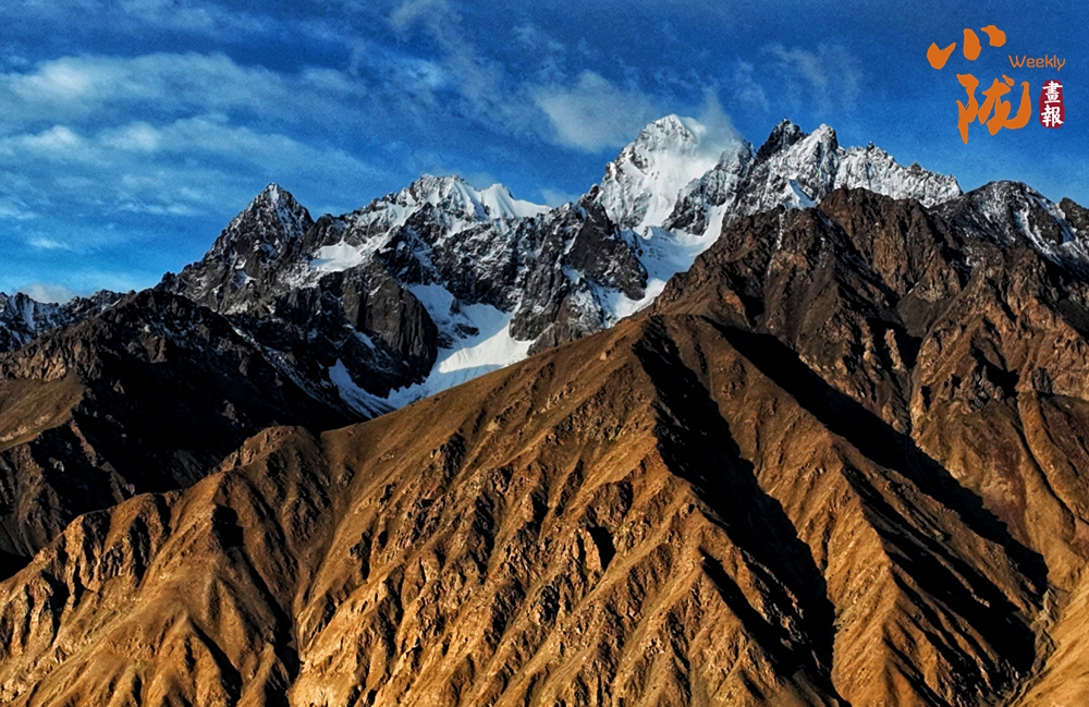 山頂白雪皚皚,熠熠生輝,裸露的山骨終年積雪不化;山下樹(shù)綠花開(kāi),青山碧水,風(fēng)景如畫(huà)。