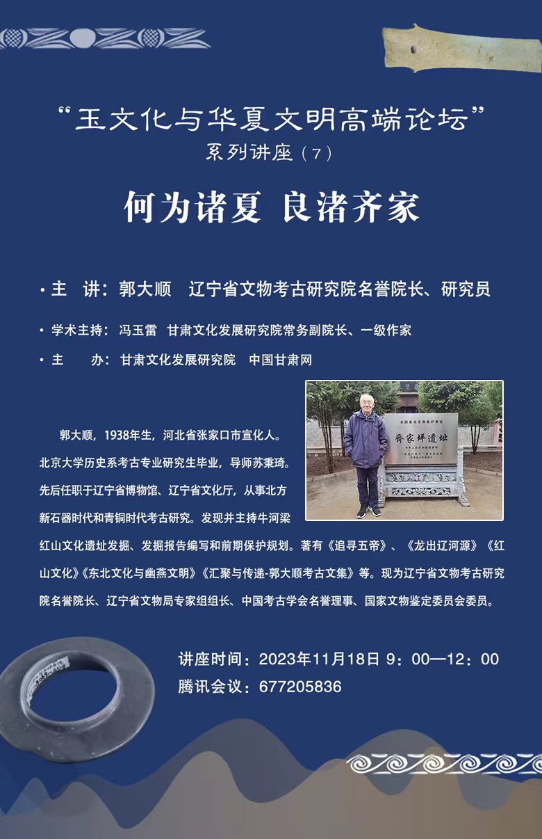 11月18日上午,遼寧省文物考古研究院名譽(yù)院長、遼寧省文物局專家組組長、中國考古學(xué)會常務(wù)理事郭大順研究員在線上做了題目《何為諸夏,良渚齊家》的學(xué)術(shù)報(bào)告。這是甘肅文化發(fā)展研究院和中國甘肅網(wǎng)聯(lián)合舉辦的“玉文化玉華夏文明高端論壇”系列講座第五講,由甘肅文化發(fā)展研究院常務(wù)院長、一級作家馮玉雷主持,西北師范大學(xué)公選課《中國玉文化》學(xué)子及鄧淑蘋、薛新明、徐琳、王方、韓斝等玉學(xué)家參會并討論。