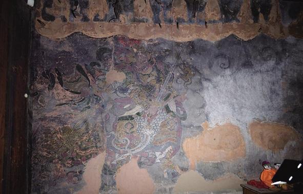現(xiàn)建筑保存完好,塑像多被破壞,僅存明代懸塑七尊,塑像腳底踩踏祥云,衣帶飄逸靈動(dòng),面容栩栩如生。東西兩壁留有四位天神畫像。殿內(nèi)遺留的龐、劉、茍、畢四大雷部元帥門壁畫,與門楣上方的懸塑和拱眼壁上繪畫的尊神,均是研究明代道教藝術(shù)的珍貴遺存,是當(dāng)?shù)厝?、道、佛三教并存,多元文化共同發(fā)展的歷史見證,對研究土司文化具有重要價(jià)值。