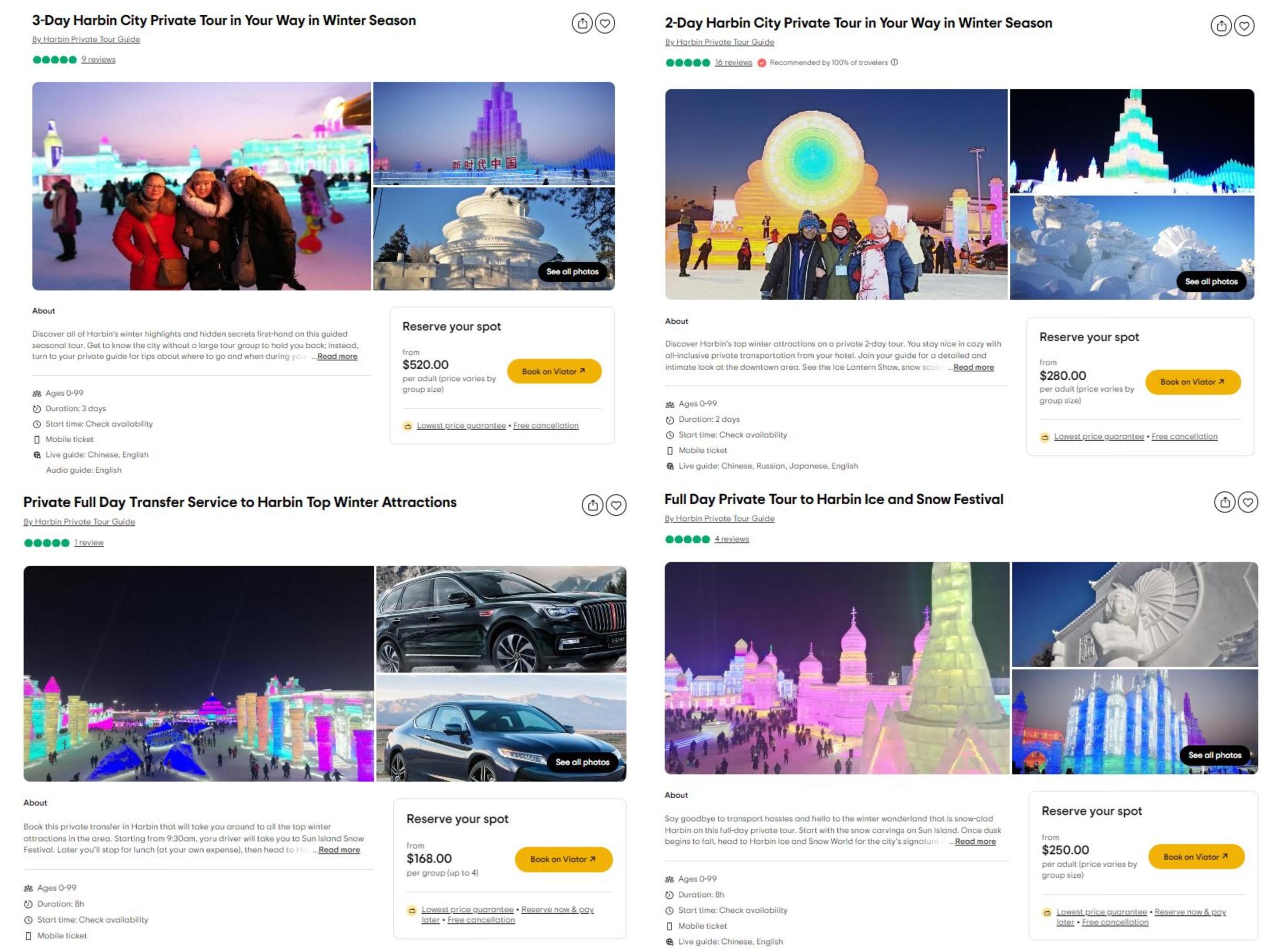 中新財經(jīng)查看Tripadvisor網(wǎng)站發(fā)現(xiàn),該平臺上有數(shù)十個關(guān)于哈爾濱旅游的服務(wù)。其中,“哈爾濱市冬季私人三日游”每位成人收費520美元起,“哈爾濱市冬季私人兩日游”每位成人收費280美元起,這兩個服務(wù)的費用不包括門票,包括私人導(dǎo)游服務(wù)、交通費(私人汽車或公交車/出租車)、酒店接送;“哈爾濱冬季熱門景點私人全日接送”每團(tuán)收費168美元起(最多4人),費用不包括門票等,包括私人汽車、私人司機服務(wù)、燃油附加費。