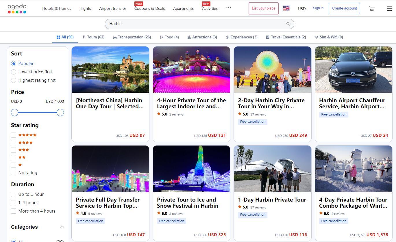在線預(yù)訂平臺Agoda上也可以搜索到數(shù)十個關(guān)于哈爾濱旅游的服務(wù)。大約8小時的“哈爾濱一日游”,包括私人導(dǎo)游服務(wù)和用車費用,收費97美元起。為期2天的“哈爾濱市私人旅游”,包括私人導(dǎo)游服務(wù)、交通費(私人汽車或公交車/出租車)、酒店接送,收費249美元起。(中新網(wǎng)財經(jīng) 記者 吳家駒)