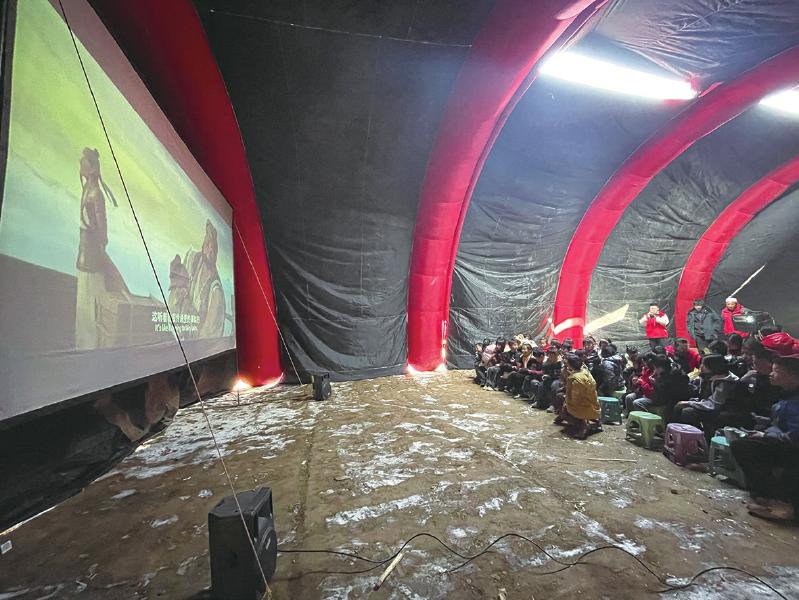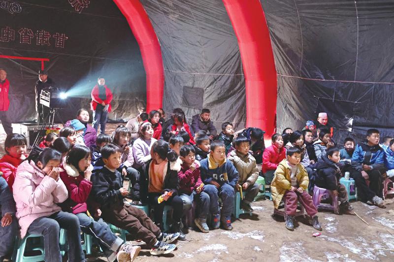 冬日的嚴(yán)寒擋不住震區(qū)群眾的觀影熱情。帳篷內(nèi),電影《英雄若蘭》《新神榜:楊戩》先后放映,孩子們分排而坐,被影片生動有趣、跌宕起伏的情節(jié)深深吸引,不時(shí)傳出歡聲笑語。“志愿者給我們放電影,豐富了我們的文化生活。”正在觀影的村民呂鵬說。