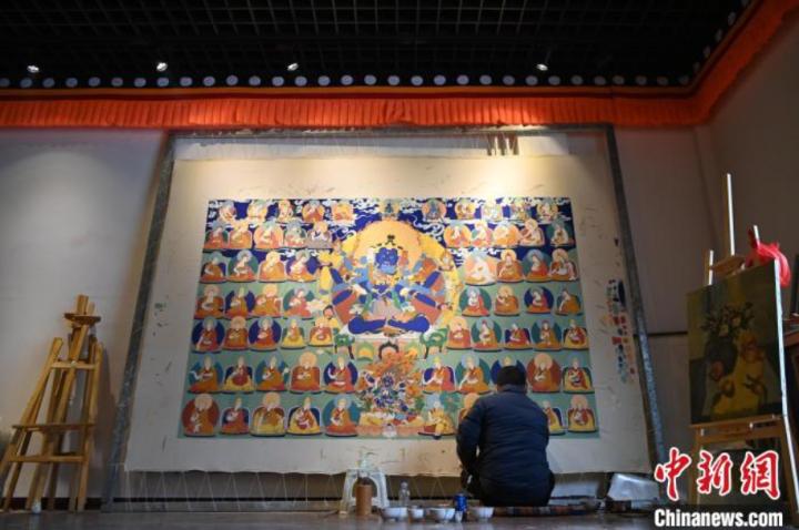 與外界慶祝節(jié)日的熱鬧“余溫”不同,25日,“世界藏學(xué)府”拉卜楞寺比鄰的唐卡小鎮(zhèn),一間畫室內(nèi)悄然無聲,唐卡師旦正嘉盤腿席地而坐,蘸取染料、勾線、上色,埋頭完成近整面墻高的巨幅唐卡。大大小小已完成的唐卡和各色顏料,填充了這所略大于教室的空曠房間。