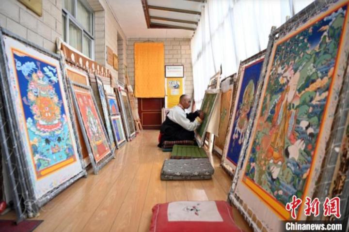 精品唐卡展廳展示甘南藏族唐卡國(guó)家級(jí)代表性傳承人交巴加布,及其父親的唐卡作品,常吸引游人“打卡”。(資料圖)中新社記者 九美旦增 攝