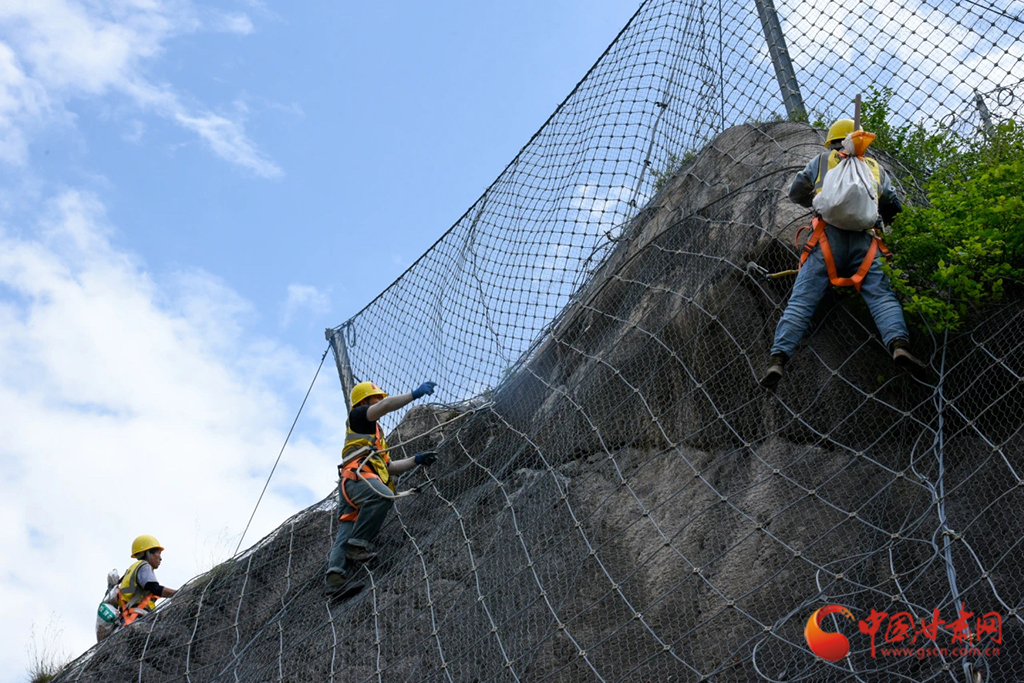 近日,隴海鐵路魏家磨1號隧道上方的山體上,蘭州鐵路局定西工務段新陽鎮(zhèn)橋路養(yǎng)修工區(qū)的作業(yè)人員,一手抓安全繩,一手拿檢查錘,攀附在懸崖峭壁上仔細排查防護網(wǎng)內(nèi)危石情況,及時消除落石隱患。