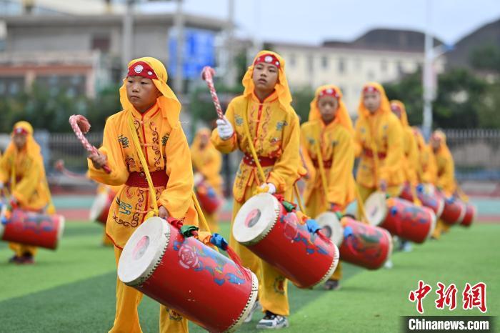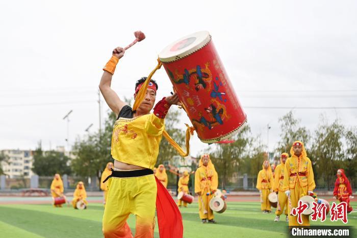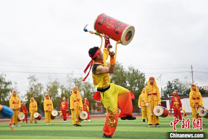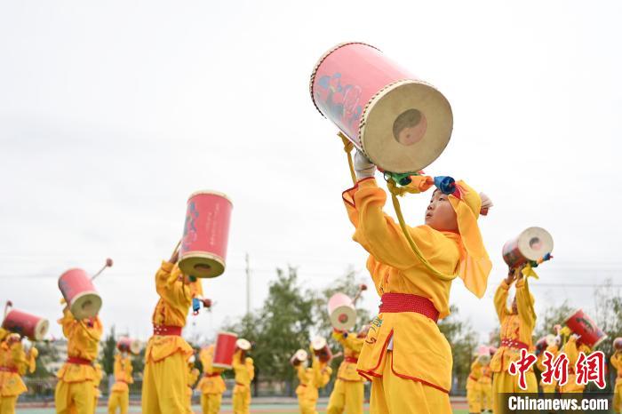 9月9日,甘肅省蘭州市皋蘭縣三川口學(xué)校學(xué)生練習(xí)蘭州太平鼓。近年來(lái),皋蘭縣將國(guó)家級(jí)非物質(zhì)文化遺產(chǎn)蘭州太平鼓納入各中小學(xué)課后服務(wù)內(nèi)容,成立中小學(xué)太平鼓隊(duì)13支,定期邀請(qǐng)非遺傳承人走進(jìn)校園,進(jìn)行傳統(tǒng)文化授課和培訓(xùn),使學(xué)生親身感受中華優(yōu)秀傳統(tǒng)文化的魅力。蘭州太平鼓舞已有六百余年的歷史,素有“天下第一鼓”之稱,2006年被列入中國(guó)第一批非物質(zhì)文化遺產(chǎn)名錄。中新社記者 九美旦增 攝