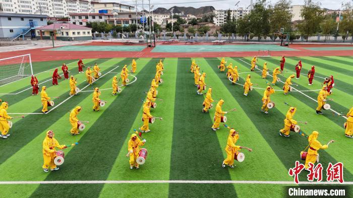 9月9日,甘肅省蘭州市皋蘭縣三川口學(xué)校學(xué)生練習(xí)蘭州太平鼓。中新社記者 九美旦增 攝