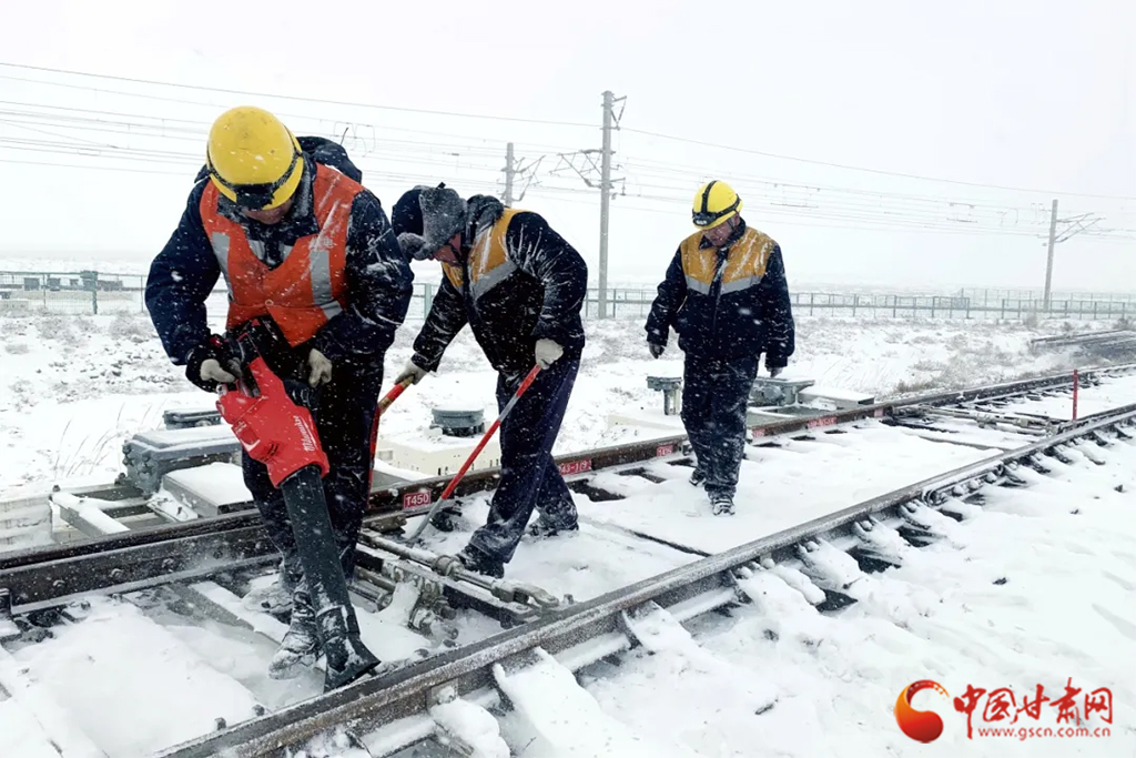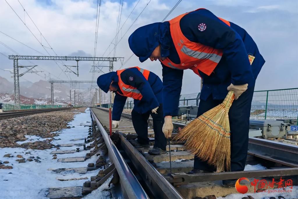 武威工務段芨嶺、山丹線路車間以雪為令,組織干部職工清掃道岔尖軌、滑床板、轉轍機等關鍵部位的積雪積冰,確保線路狀況良好。