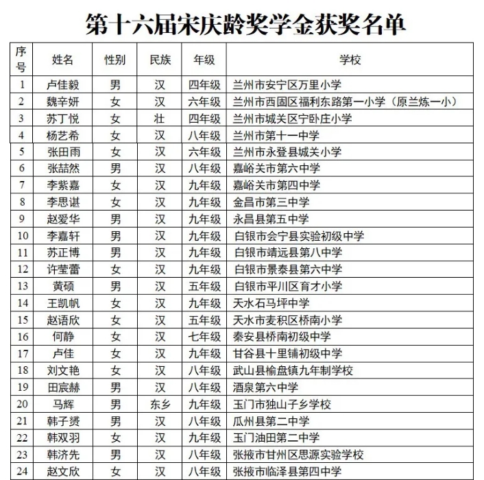 日前,經(jīng)地方各級教育行政部門推薦,第十六屆宋慶齡獎學金獲獎名單公布,全國共有1542名學生獲獎,其中甘肅56人。