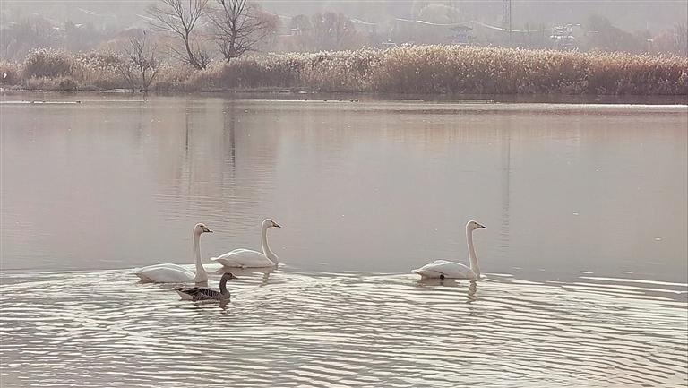 “生態(tài)學(xué)研究上有一個詞叫對棲息地的忠誠度,這個地方第一次發(fā)現(xiàn)大天鵝是在2019年的12月底,這幾年來得越來越早,說明這些大天鵝對這個地方越來越認(rèn)可。”蘭州大學(xué)生態(tài)學(xué)院野生動物多樣性監(jiān)測與保護(hù)團(tuán)隊負(fù)責(zé)人張立勛說,大天鵝對棲息地都有一個忠誠度的問題,就像人“戀舊”一樣,大天鵝在這里生活得很安逸,它們才會常來,這也是近幾年來我們生態(tài)保護(hù)方面的成效。