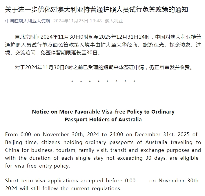 據“中國駐澳大利亞大使館”微信公眾號消息,自北京時間2024年11月30日0時起至2025年12月31日24時,中國對澳大利亞持普通護照人員試行單方面免簽政策入境事由擴大至來華經商、旅游觀光、探親訪友、過境、交流訪問,免簽停留期限延長至30日。