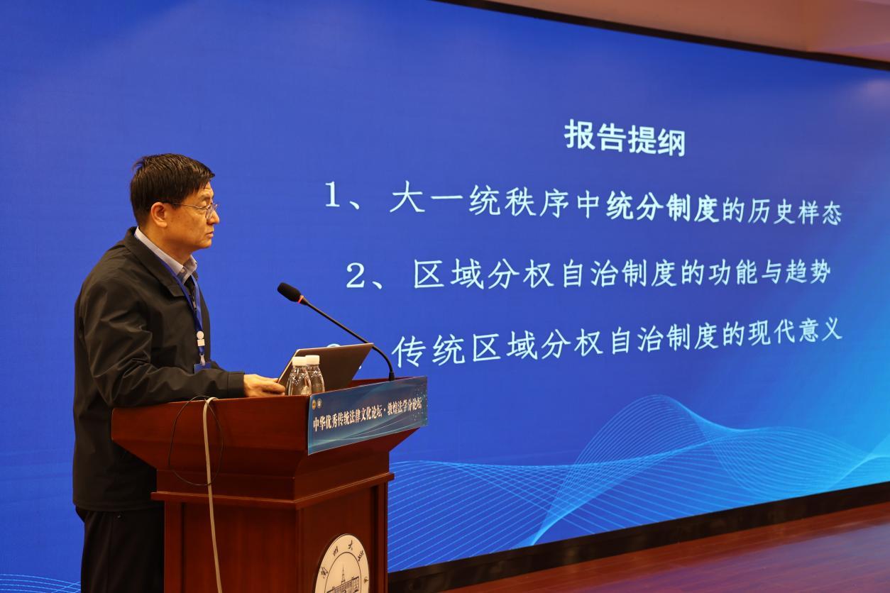 中國社會科學院法學研究所二級研究員、博士生導師、法制史研究室主任、中國法律史學會會長、第七屆“全國十大杰出青年法學家”張生,從大一統(tǒng)秩序中統(tǒng)分制度的歷史樣態(tài)、區(qū)域分權自治制度的功能與趨勢、傳統(tǒng)區(qū)域分權自治制度的現(xiàn)代意義等方面作了題為“大一統(tǒng)秩序下的統(tǒng)分制度及其現(xiàn)代意義”的主旨報告。