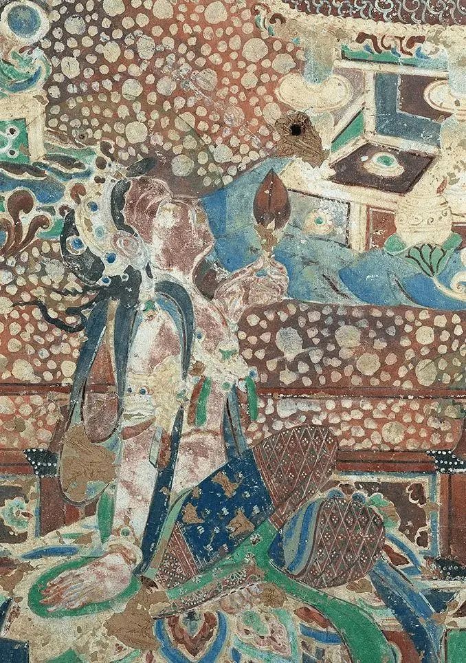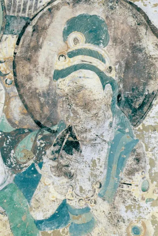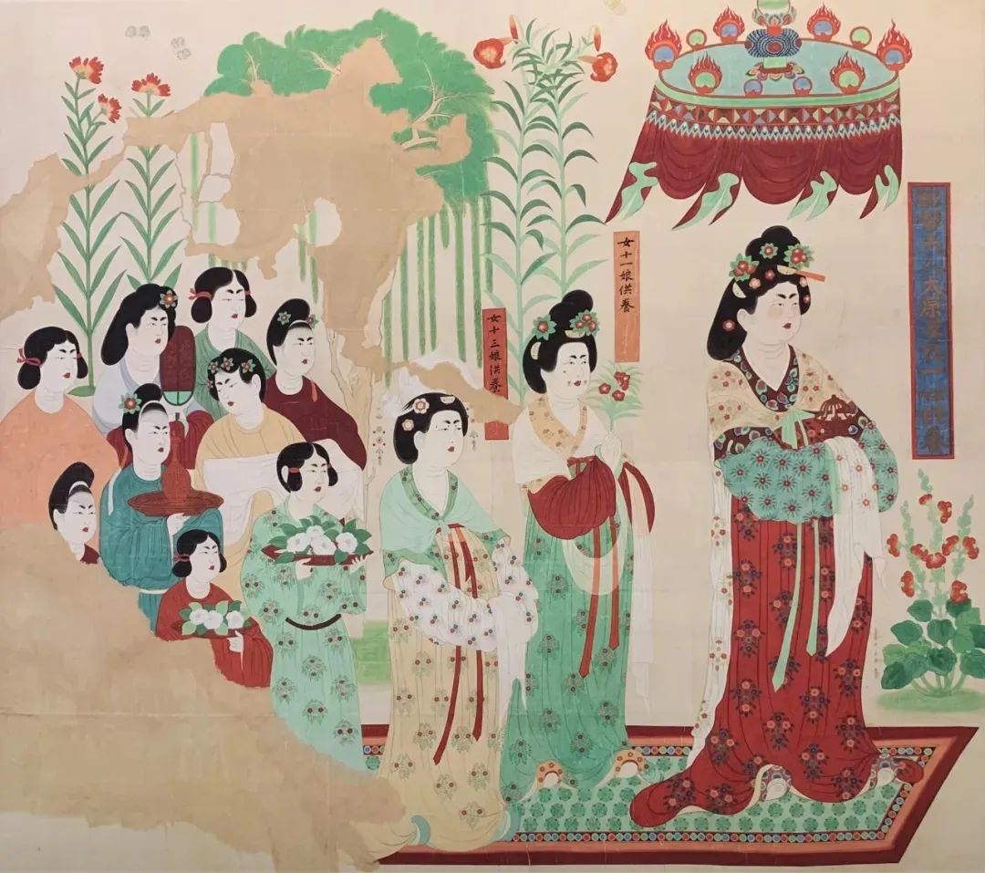 ?。?)莫高窟第130窟飛天壁畫修復當我在第161窟修復壁畫時,突然聽到洞窟外一聲巨響,我猜想,應該是洞窟發(fā)生了坍塌。于是我趕緊循聲而去,發(fā)現(xiàn)發(fā)出巨大聲響的是第130窟,第130窟北壁上部壁畫為飛天,其中空鼓壁畫大面積脫落,有2平方米多。脫落的壁畫掉在了佛腳上,碎成了一地。未脫落壁畫的邊緣十幾厘米都已脫離墻壁,隨時有脫落的風險。我于是向常書鴻先生匯報,然后我們上報國家文化部。國家文化部批示,對第130窟進行加固維修。