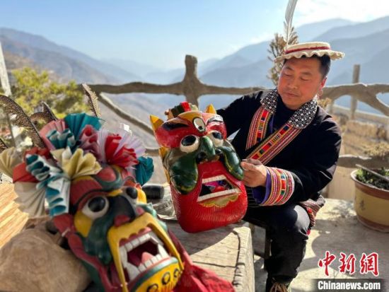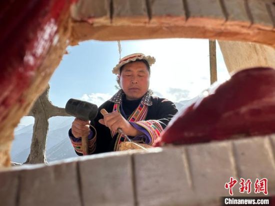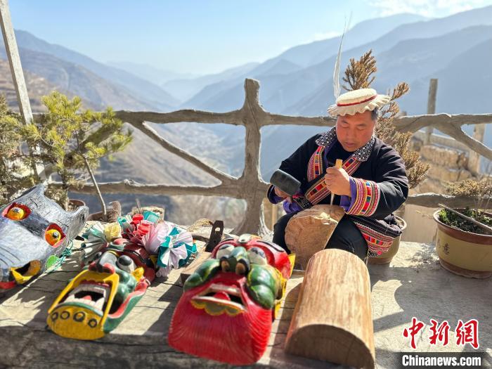雕刻、打磨、上色……甘肅隴南市文縣鐵樓藏族鄉(xiāng)強(qiáng)曲村,白馬人薛剛一家四代人都精于木工。日前中新網(wǎng)記者走訪村子時(shí),薛剛坐在自家院子里,伏案制作池哥晝所用面具。池哥晝是白馬人保留最完整、最具特色民族舞蹈,面具是重要道具之一。薛剛制作的面具不僅用于周邊村子的池哥晝中,而且被廣州、上海等地的客商購買收藏。他時(shí)常將自己的想象融入面具中,用心打磨使其更具“靈氣”。他說,白馬人中從事面具雕刻的手藝人不多,最近他物色了一個(gè)“00后”徒弟,對方興趣濃厚,希望將這門手藝保護(hù)傳承好。圖為薛剛在院子里雕刻面具。閆姣 攝