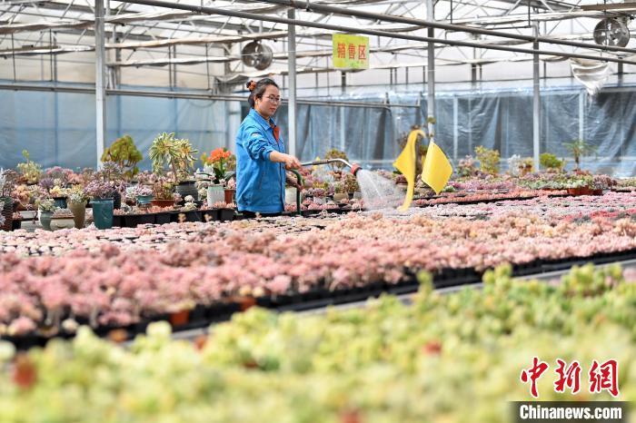 3月12日,在甘肅省蘭州市紅古區(qū)鑫源現(xiàn)代農(nóng)業(yè)科技示范園種植大棚內(nèi),工作人員正在管護多肉植物。中新社記者 九美旦增 攝