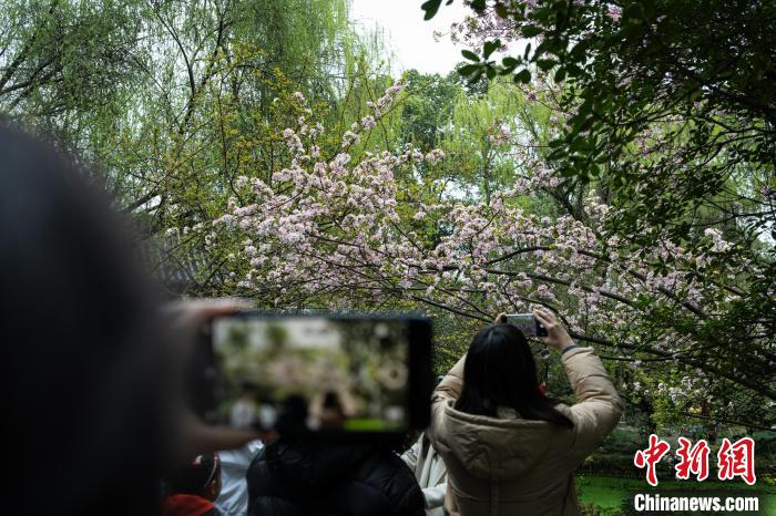 圖為3月16日,棠湖公園正大門(mén)處,垂絲海棠盛開(kāi),市民在此拍照打卡。韓金雨 攝