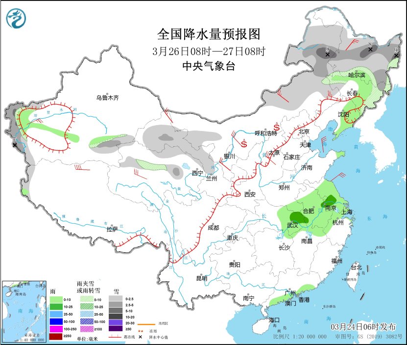 3月26日08時至27日08時,內(nèi)蒙古東部、黑龍江大部、吉林東部、新疆南疆西部山區(qū)、甘肅河西、青海北部等地部分地區(qū)有小到中雪或雨夾雪,其中,內(nèi)蒙古東北部、黑龍江中東部、新疆南疆西部山區(qū)等地部分地區(qū)有大雪(5~9毫米)。吉林中部、遼寧東部、江淮大部、江漢東部、江南北部、廣東南部沿海等地部分地區(qū)有小雨,其中,湖北東部、安徽中部、江蘇西南部等地部分地區(qū)有中雨。內(nèi)蒙古大部、西北地區(qū)中東部、華北大部、東北地區(qū)西部、新疆南疆盆地等地部分地區(qū)有4~6級風(fēng)。內(nèi)蒙古中西部、寧夏等地部分地區(qū)有揚沙。