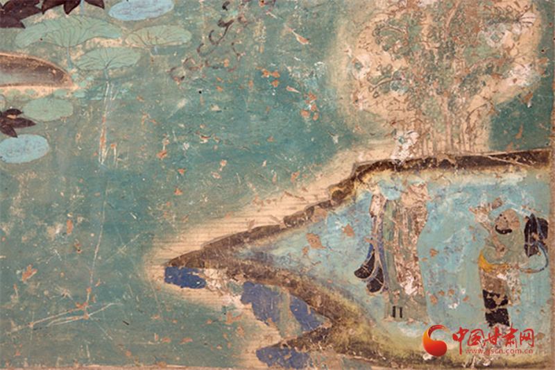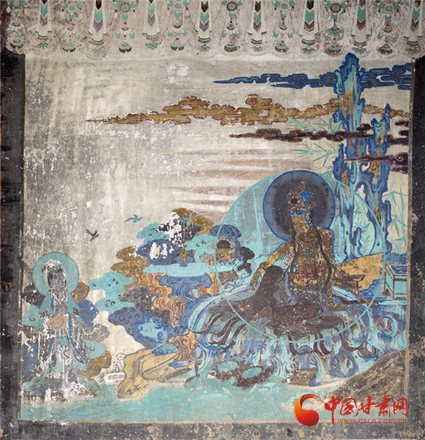 兩幅作品均以青綠色調為主,觀音面部貼金雖已氧化,卻仍顯清新淡雅,更以“馬一角、夏半邊”的構圖巧思,用對角線分割畫面、大量留白,讓有限的壁面生出無窮空間感,堪稱中國傳統(tǒng)美學與佛教哲理的完美融合——正如唐代白居易贊水月觀音“凈淥水上,虛白光中”,這般意境在榆林窟的壁畫里被演繹得淋漓盡致。