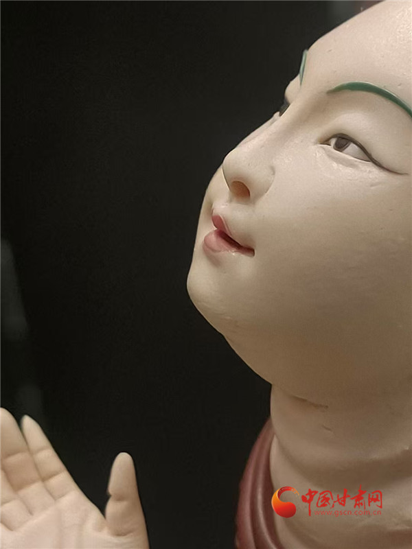 今年蘭洽會甘肅非遺館,正中央的敦煌文化題材《觀無量壽經(jīng)變》面塑受到客商全員追捧。經(jīng)過這里的人都會駐足欣賞,感受面塑藝術(shù)的精彩絕倫,其中,敦煌題材的面塑,飛天人物似乎從壁畫里飛了出來,栩栩如生。
