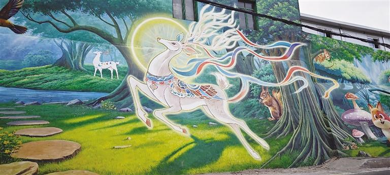 這些色彩斑斕的墻繪以城關(guān)區(qū)深厚的文化底蘊為底色,將民俗風情、自然生態(tài)與城市記憶巧妙交織。在伏龍坪街道,一面巨幅“舞獅”墻繪氣勢恢宏,紅黃相間的獅子昂首騰躍;在山間步道旁,“九色鹿”悠然立于云霧之間,靈動雙眸映照山河,將敦煌文化的神秘與自然之美娓娓道來。