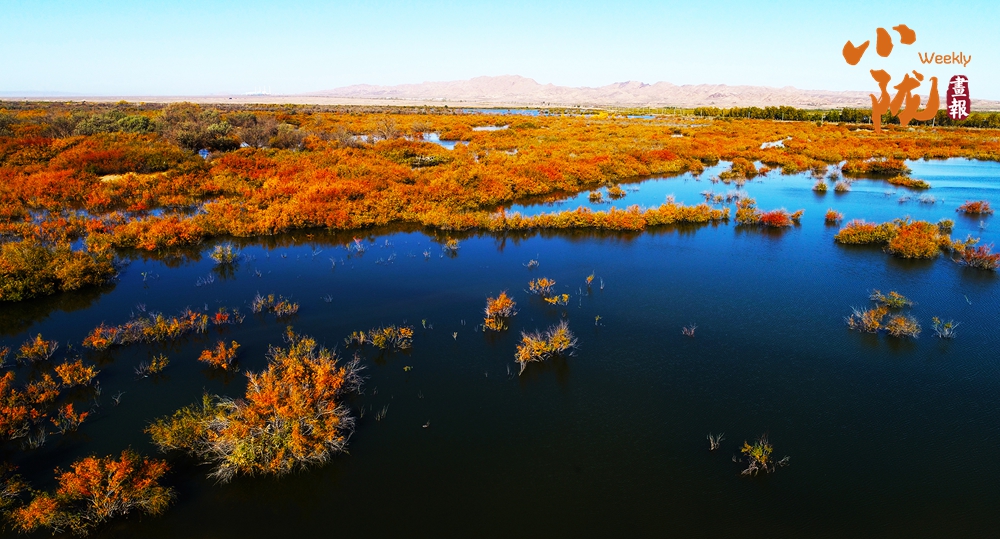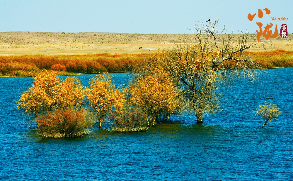 天藍(lán)藍(lán),水藍(lán)藍(lán),水天一色。紅柳簇?fù)沓裳?,燃燒在水中央,顯得格外奪目,展現(xiàn)出荒漠特有的壯美與生機。