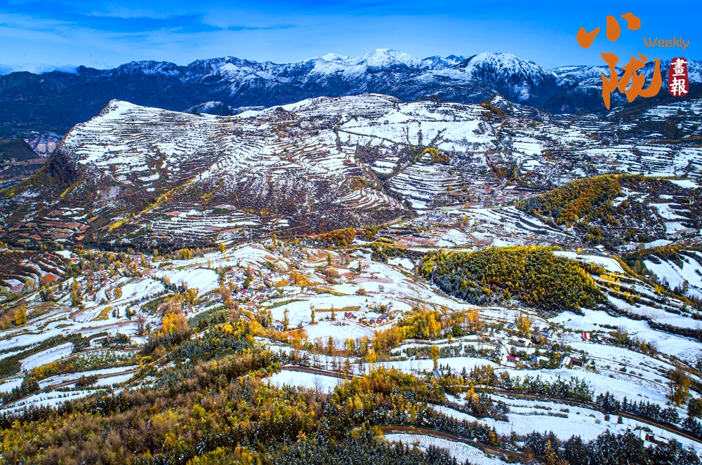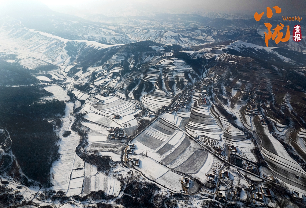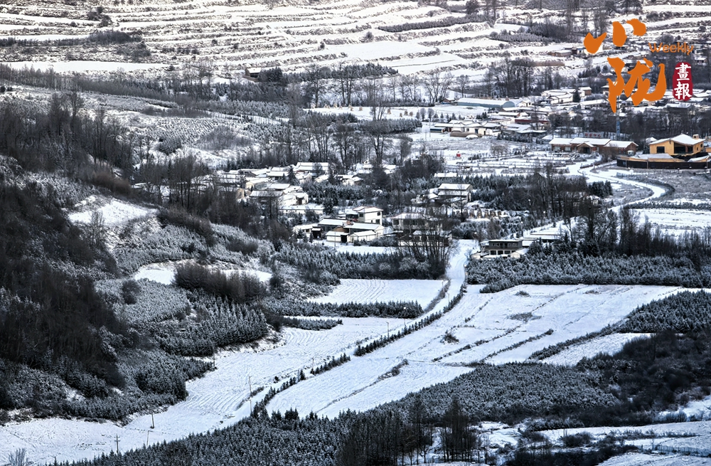 道路、溝壑、樹木、村落,被皚皚的白雪所覆蓋,呈現(xiàn)出一片“雪落山川白,美景入畫來(lái)”的美麗景象。