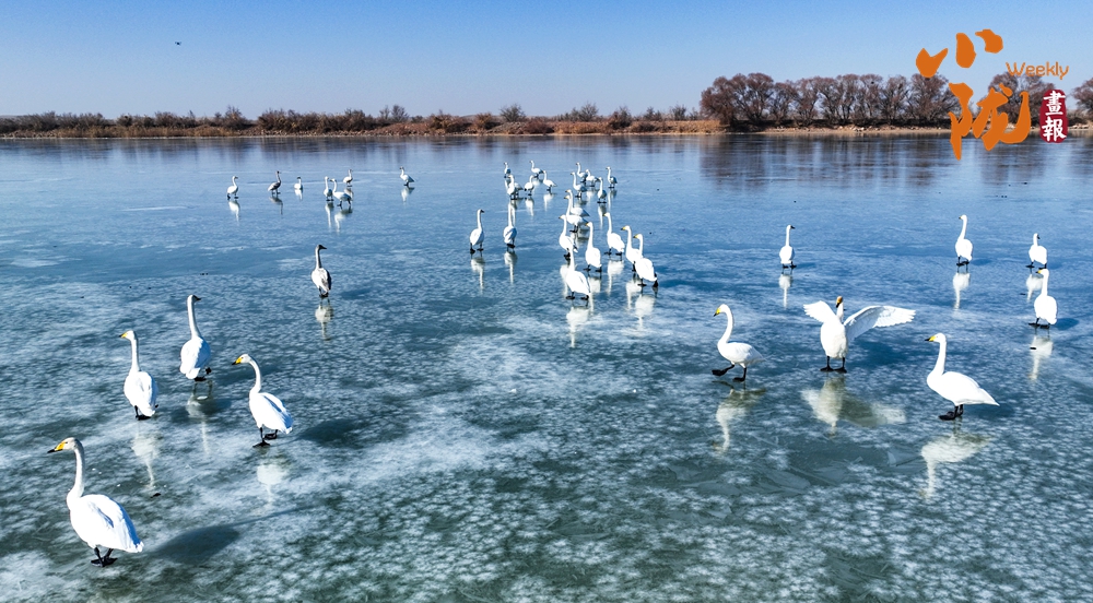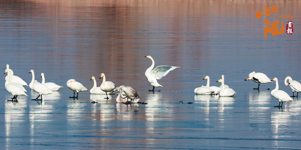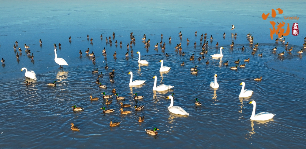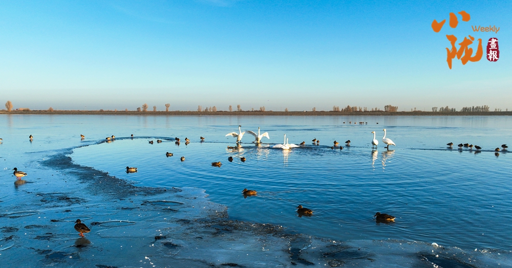陽(yáng)光斜照,萬(wàn)物生暖。水面上,成群的白天鵝不緊不慢地游著,雪白的身影倒映水中,隨著微波輕輕蕩漾,像是一幅流動(dòng)的水墨畫(huà),素雅而安寧。