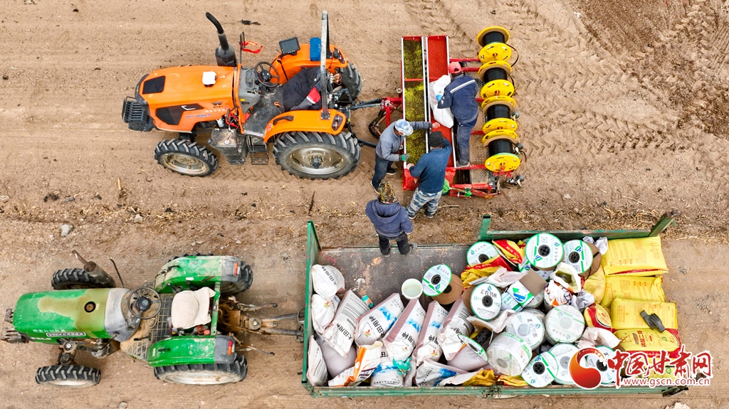 3月12日,張掖市高臺縣巷道鎮(zhèn)殷家橋村綠色高效小麥種植基地上,農(nóng)戶們正在將小麥種子、有機肥料投入播種一體機。